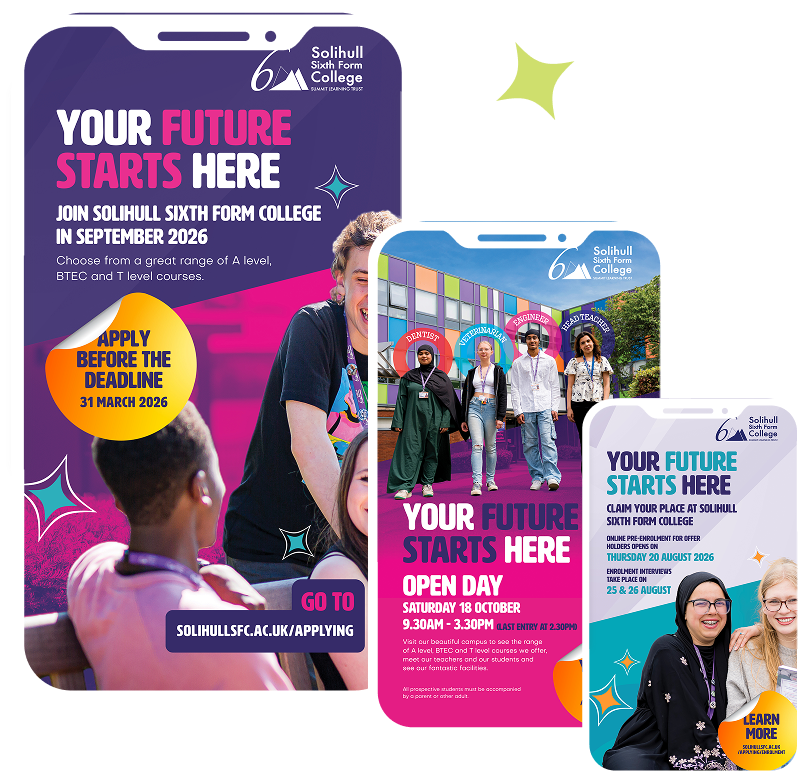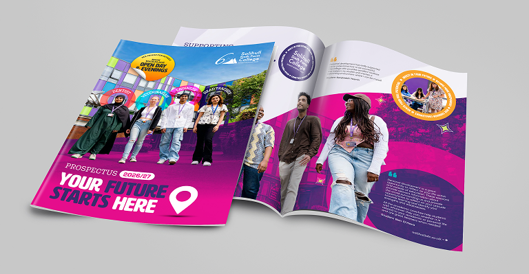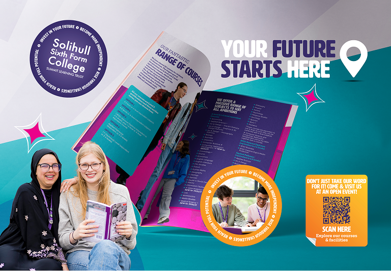 Solihull Sixth Form College is a highly regarded provider of A level, BTEC, and T level courses for 16–19-year-olds in the Solihull and Birmingham area. To support student recruitment for the 2026–27 academic year, the college engaged a marketing agency to design and print a new sixth form prospectus, along with creating related promotional materials in a modern, cohesive style.